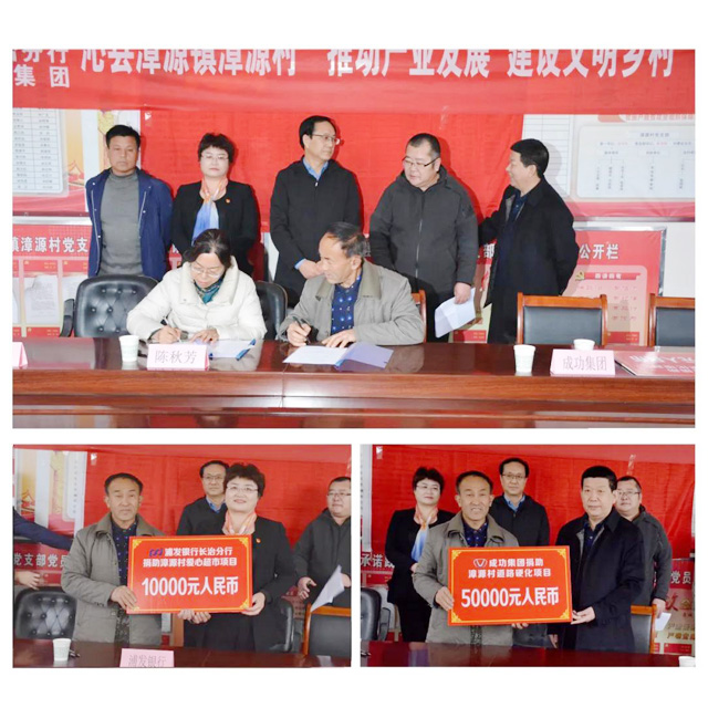 驻村工作队简要汇报了驻村扶贫工作之后,由山西成蹊博苑农业科技有限公司与漳源村签订了《矮化大樱桃树苗订购及种植服务协议》并举行了产业扶贫项目签约仪式和威廉希尔中文网站捐助漳源村道路硬化项目、浦发银行长治分行爱心超市捐助仪式。威廉希尔中文网站党委书记陈建法、浦发银行长治分行副行长李亚玲分别代表爱心捐助企业发言。