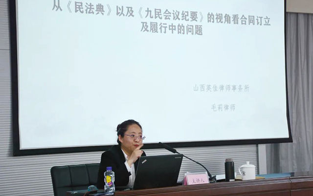 根据集团领导的指示要求,为促使集团“外树形象、内强管理、聚精会神、持续发展”工作总方针的要求更好的融入集团法治建设实践, 4月12日下午,集团特邀山西英佳律师事务所毛莉律师对《民法典》以及《九民会议纪要》中合同订立及履行需关注的问题进行解读。其目的就是为了更好的弘扬法治精神,进一步提高各级人员的法治意识,确保公司运营依法办事、规范经营、防控风险。