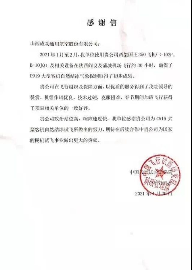 4月20日,来自中国试验飞行研究院的一封感谢信在成功通航成了大家热议的话题,这是感谢成功通航两架空中国王350(B-102P、B-10JQ)机组成员,以优质的服务为国产大型客机自然结冰气象探测所做出的努力。