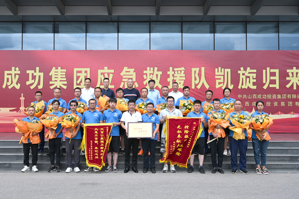 由十几名同事组成的礼仪队依次给英雄们献上鲜花,表示集团对救援队的慰问。
