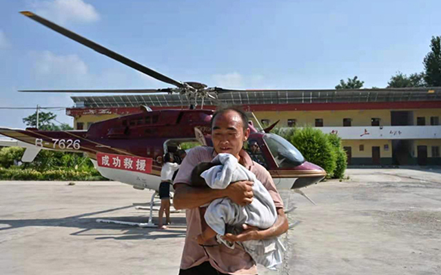救援队深入灾区一线,凭借机组成员过硬的技术,采取长时间低空悬停飞行作业,转移解救受困洪水中的的群众到安全地带。中午12点,飞机准时起飞。