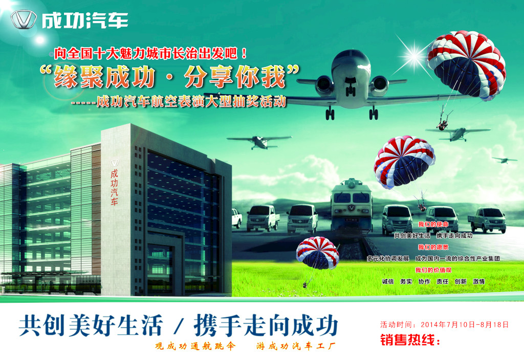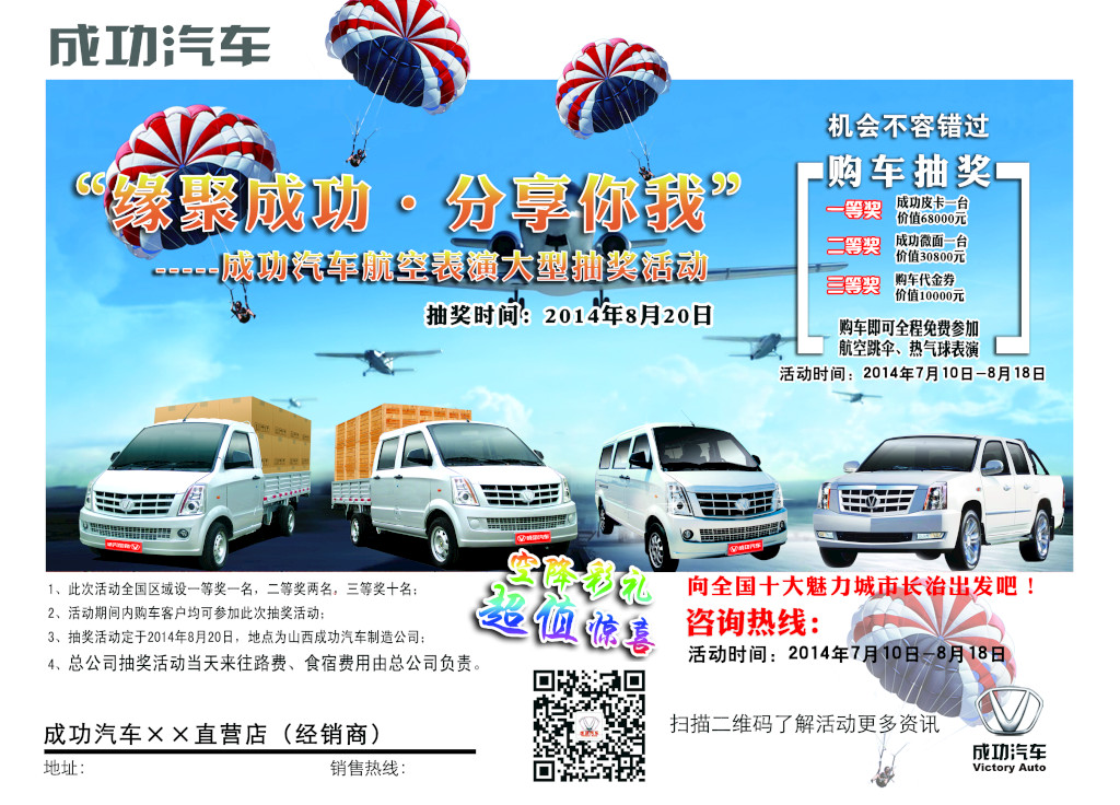 成功汽车为答谢顾客朋友们的厚爱,公司将于2014年8月20日,举办大型抽奖活动,届时将有空中跳伞、投放热气球、等大型活动助兴。