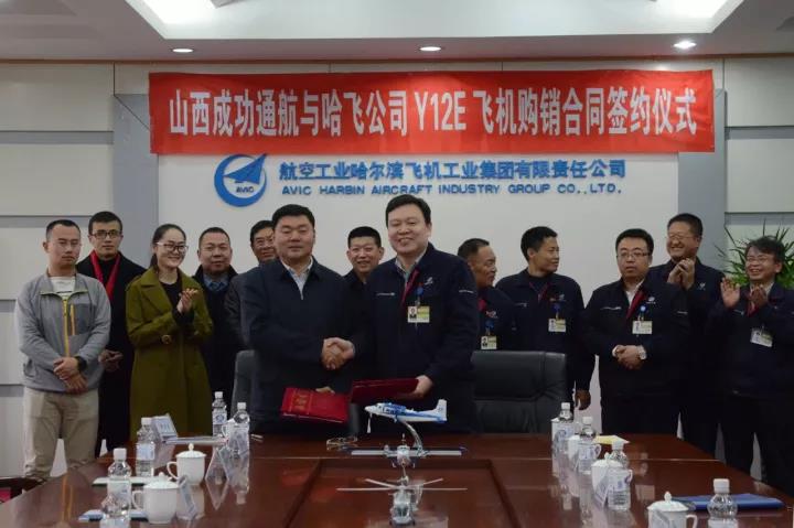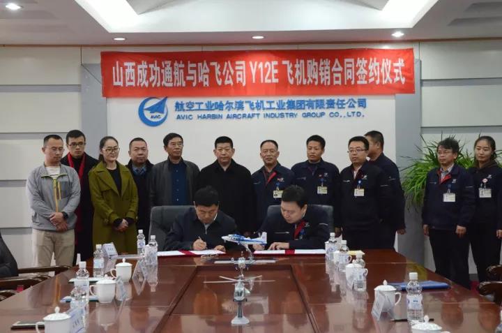 合同签约仪式在中航工业哈飞公司举行。成功通航董事长马国利与中航哈飞副总经理谷海成分别在购销合同上签字。中航哈飞副总经理谷海成对成功通航选购运12E飞机表示感谢。他希望通过合同的签订,推动双方合作迈向新起点。成功通航董事长马国利表示,多年来,山西干旱少雨,不论是人工降雨还是森林灭火,运12飞机都有着巨大的市场需求。他希望中航哈飞能够尽快完成运12E飞机灭火型的研制工作,为双方后续的进一步合作奠定基础。另外,中航哈飞设计研究所负责人作了《运12E灭火型飞机总体技术方案》汇报。签约结束后,成功通航接受了中航哈飞赠送的运12F飞机模型。此前,成功通航董事长马国利一行在中航哈飞副总经理谷海成陪同下参观了该公司23、32、35车间和哈飞通用,马国利等还走进运12E飞机进行了座舱体验。
