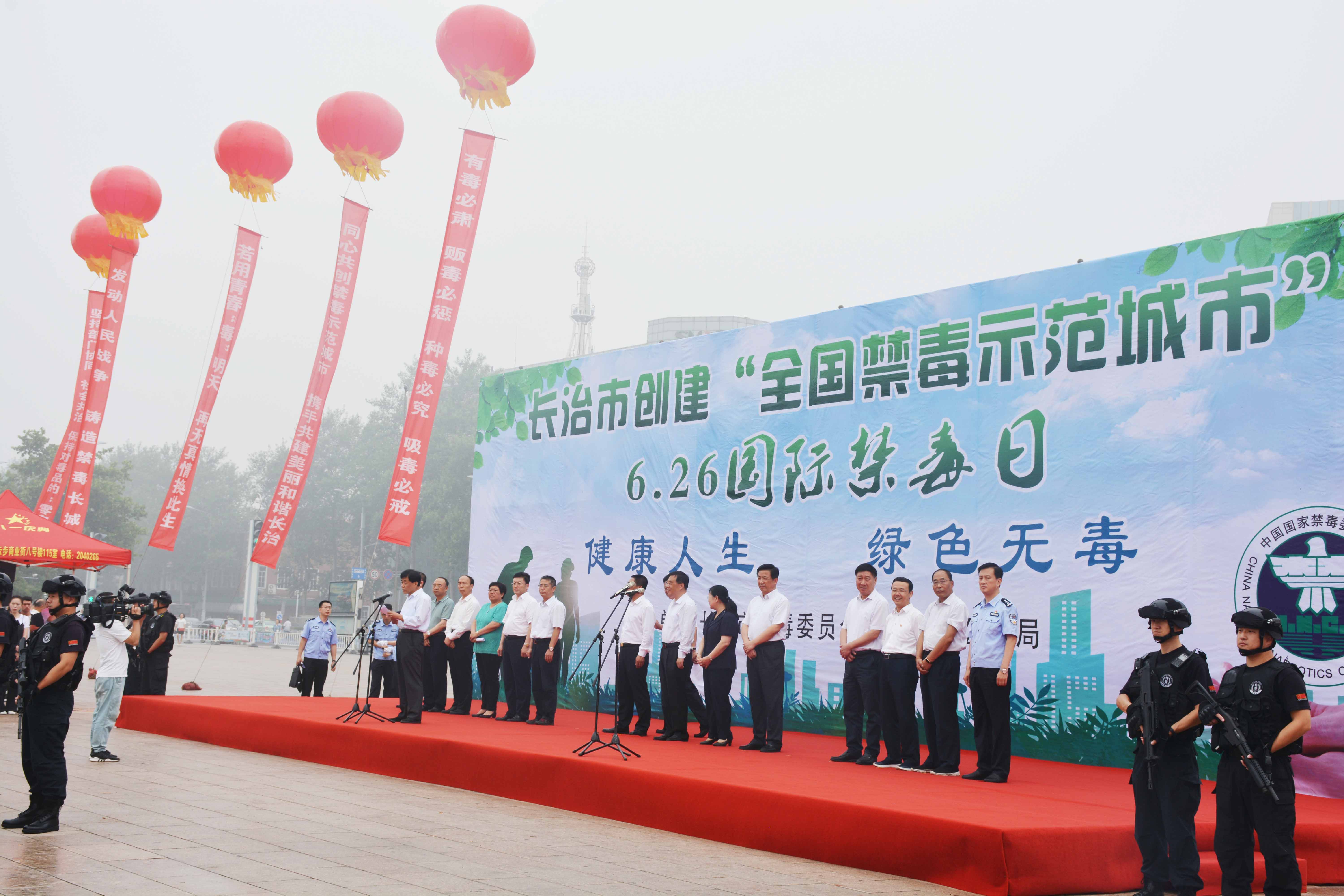 闷热的夏日,飘落的雨帘。6月26日正值第31个国际禁毒日之际,长治市禁毒委在八一广场举行了以“健康人生、绿色无毒”为主题的创建全国禁毒师范城市、6.26国际禁毒日宣传启动仪式。市委、市政府领导和市禁毒委各成员单位领导以及社会各界群众参加了启动仪式。集团副总裁赵安平与集团篮球队领队及队员到场参加。