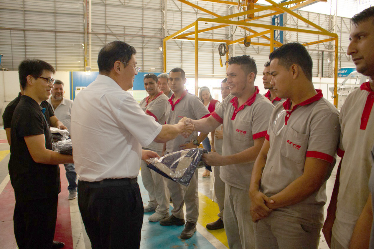 威廉希尔中文网站总裁马国利先生为巴西组装厂工人赠送成功汽车工作服