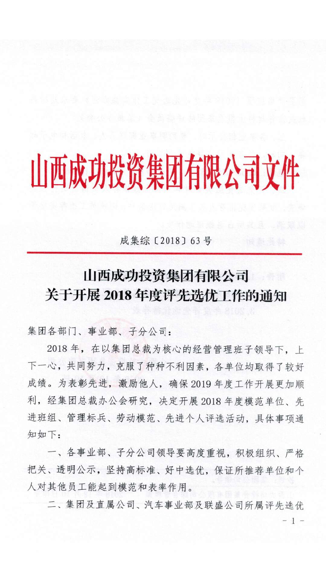 12月10日,集团以成集综【2018】63号文下发了《关于开展2018年度评先选优工作的通知》,《通知》指出,2018年,在以集团总裁为核心的经营管理班子领导下,上下一心,共同努力,克服了种种不利因素,各单位均取得了较好成绩。为表彰先进,激励他人,确保2019年度工作开展更加顺利,经集团总裁办公会研究,决定在集团范围内开展2018年度模范单位、先进班组、管理标兵、劳动模范、先进个人评选活动。