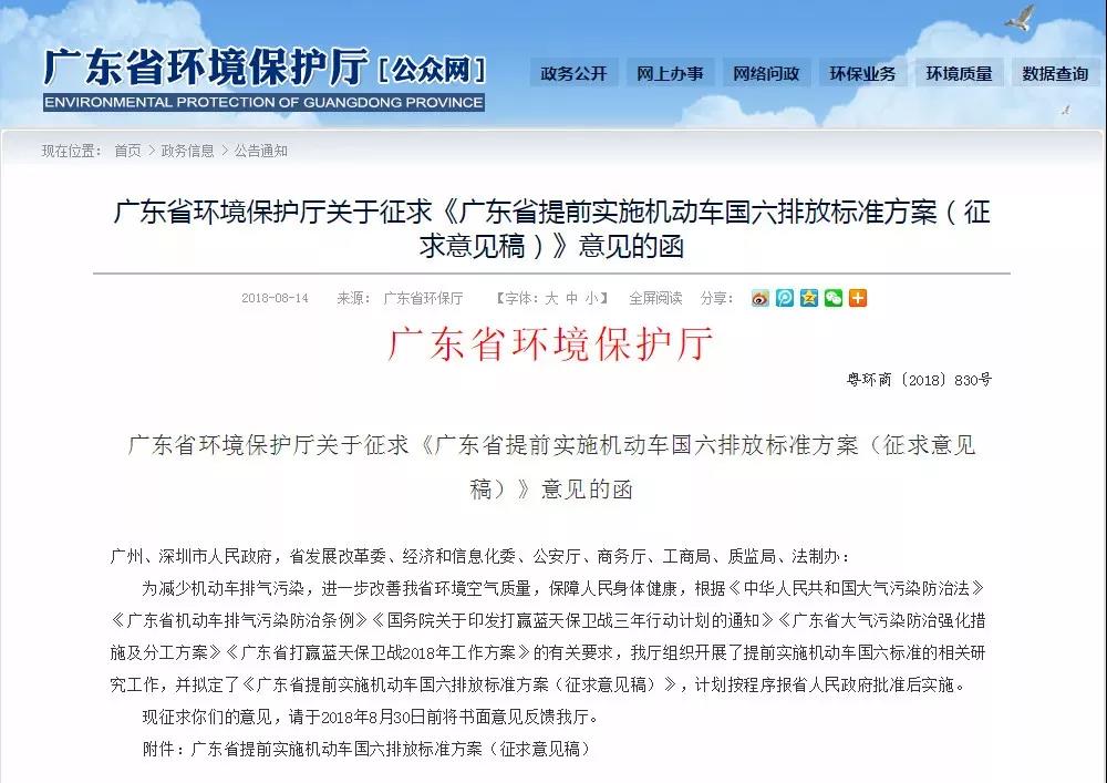 为防治机动车排气污染,进一步改善环境空气质量,2018年8月14日,广东省环境保护厅发布关于征求《广东省提前实施机动车国六排放标准方案(征求意见稿)》意见的函,决定提前实施第六阶段国家轻型汽车污染物排放标准(以下简称国六标准)。