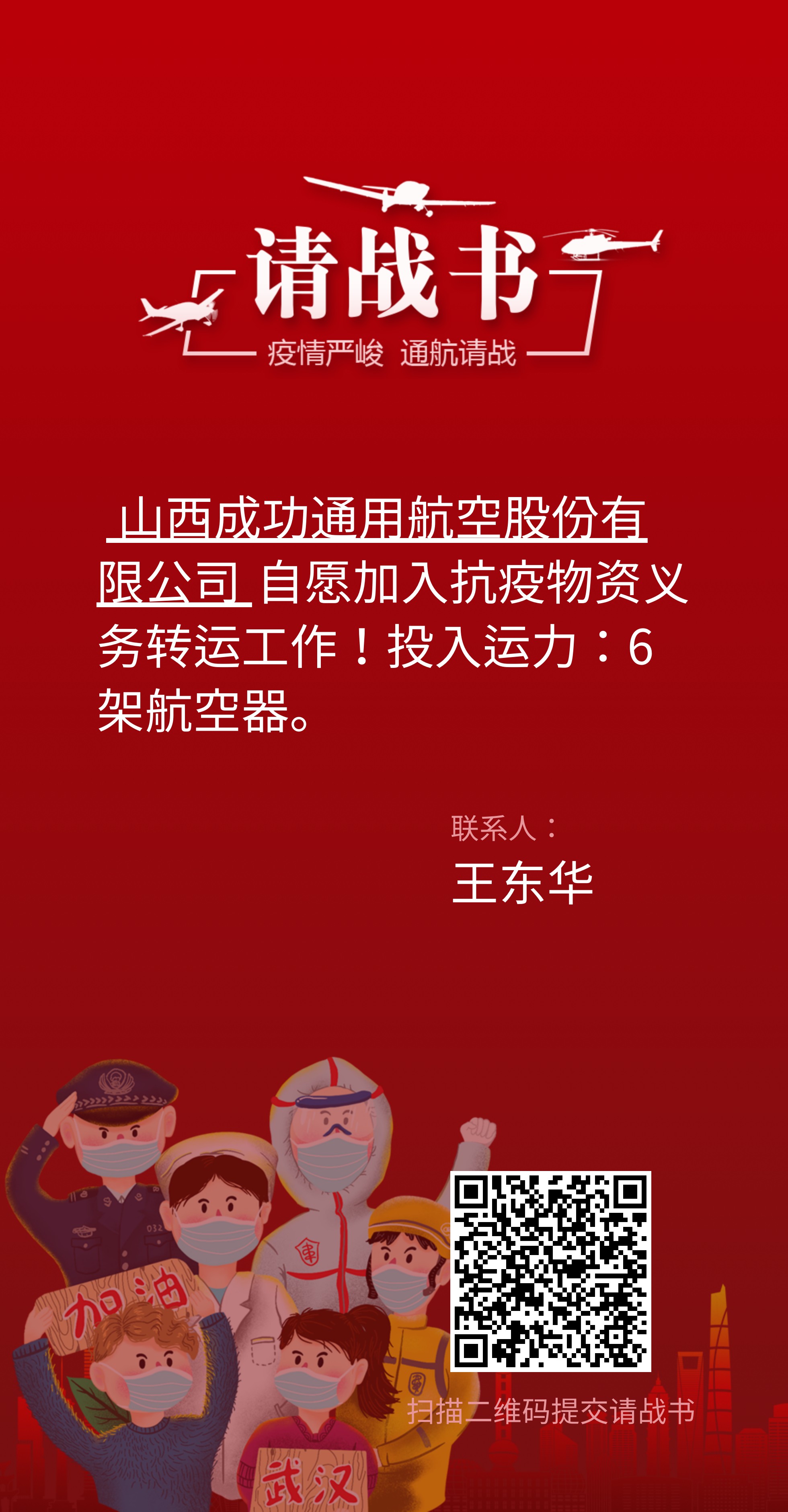 江城新型冠状病毒感染的肺炎疫情暴发后,成功通航以最快的时间作出积极响应,并向山西省应急管理厅、民航山西安全监督管理局提出请战,随时听从统一调配,奔赴抗疫一线。